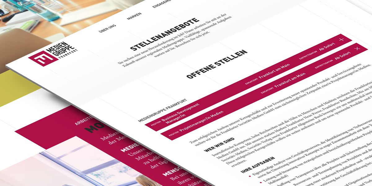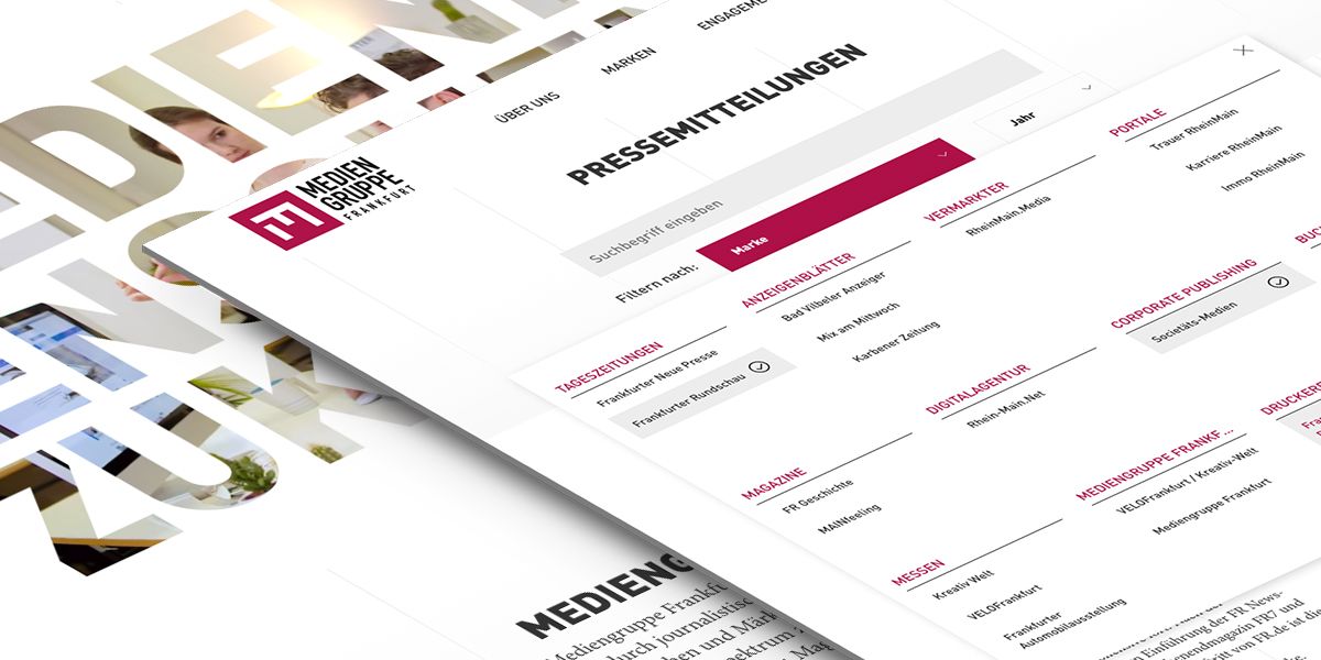 Unter dem Dach der Mediengruppe Frankfurt (Frankfurter Societäts Medien) vereinen sich viele bekannte Marken und Unternehmen aus der Medienbranche. Darunter auch mehrere Verlage und Zeitungen wie z.B. die FNP und Frankfurter Rundschau sowie eine eigene Großdruckerei. Zum Launch präsentieren sich auf dieser einen Website ganze 18 Marken der Mediengruppe inklusive großer Stellenbörse und einem Bereich für Pressemeldungen aller Unternehmen.